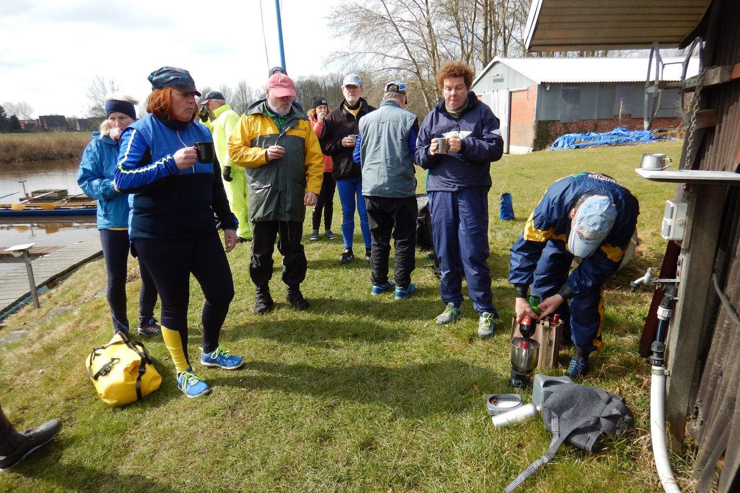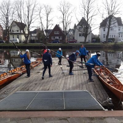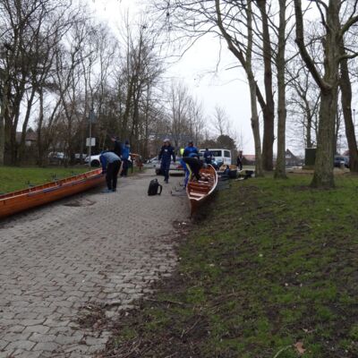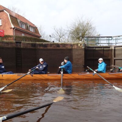 Ostersonntag steht die Tour von Greetsiel zurück nach Emden an. Glücklicherweise gibt es so viele Kanäle, dass wir keine Strecke doppelt rudern müssen. Das Neue Greetsieler Tief, das unseren Rückweg darstellt, ist aber sehr eng und morastig, sodass wir froh sind, endlich in Hinte auf einen etwas breiteren Kanal zu stoßen. Am hiesigen Wassersportverein wird nochmal eine Glühweinpause gemacht, bei der sogar die Sonne raus kommt. Es wird richtig angenehm vom Wetter her.