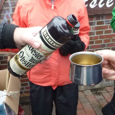 Wie gestern ist uns heute der Wind wohl gesonnen, diverse GPS-Geräte belegen uns eine Segel-Geschwindigkeit von circa 5 km/h. Über das kleine und das große Meer geht es an Wirdum vorbei bis nach Greetsiel. Um die Kälte zwischendurch etwas zu bekämpfen, haben Norbert und Nicole ihren Benzinkocher und Glühwein dabei. Auch eine Amaretto Flasche wurde aufgetrieben, sodass jeder in der Pause auf seine Kosten kam.