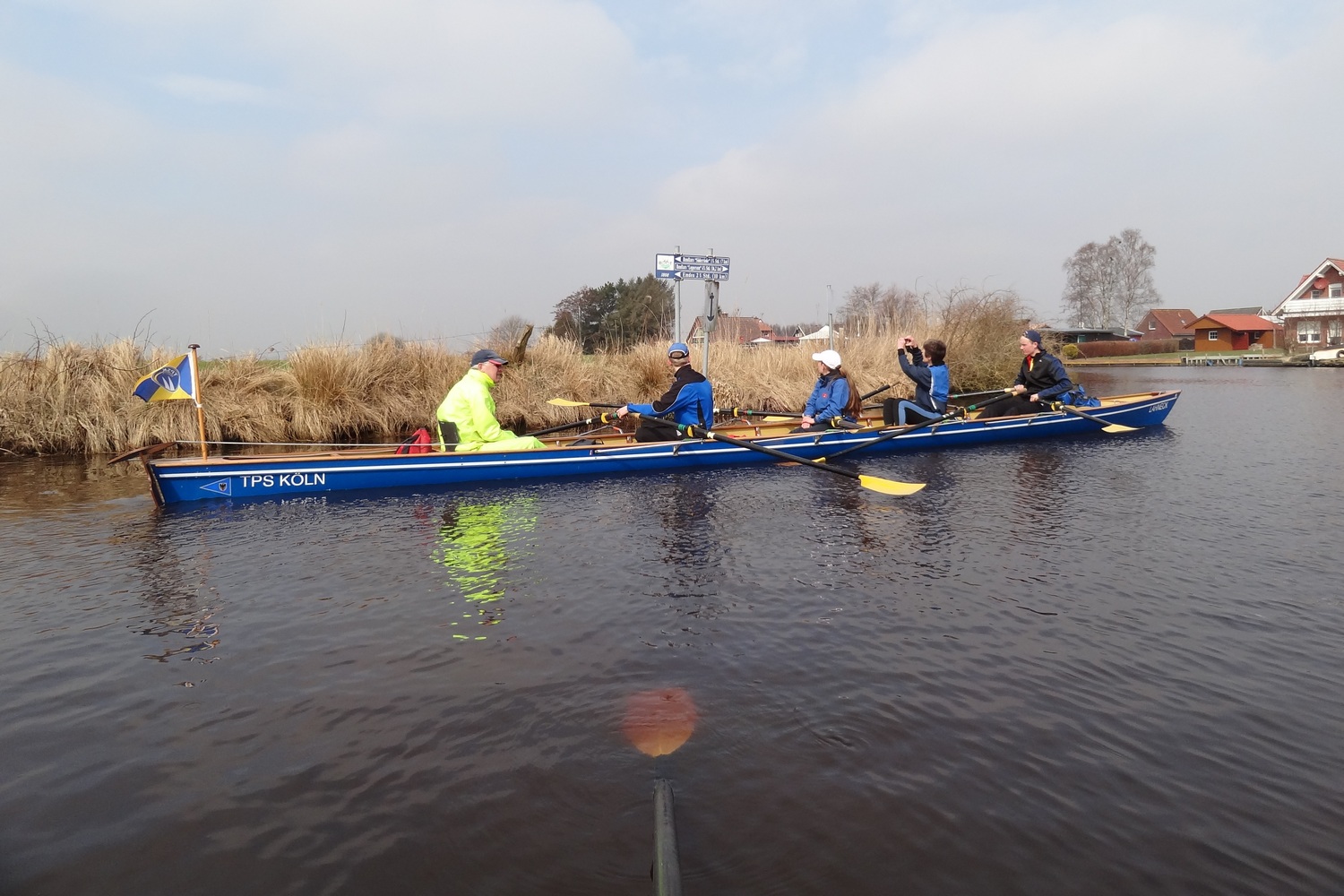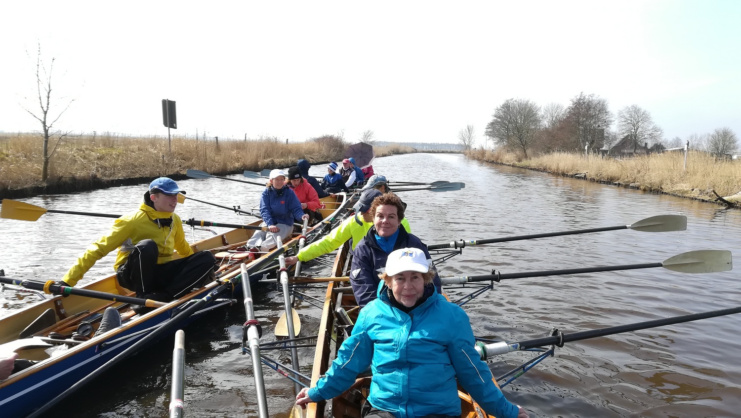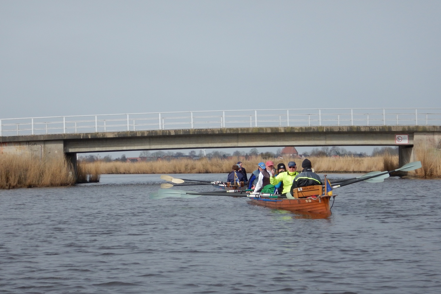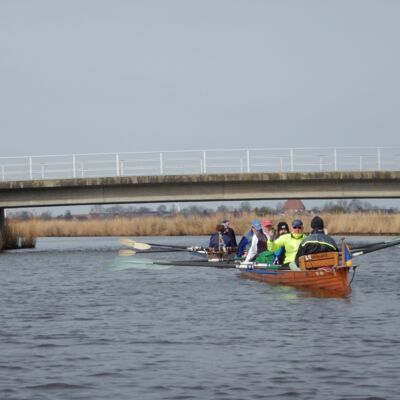 Ganz ungewohnt für uns Flussruderer ist es, dass hier so viele Kreuzungen sind, weshalb Gaby für jedes Boot eine Wasserkarte dabei hatte. Trotzdem wären wir beinahe direkt an der ersten Kreuzung falsch abgebogen: statt wie gewollt durch das Fehntjer Tief wären wir dann durch das Rorichumer Tief gerudert. Zum Glück wurde dieser Fehler aber schnell bemerkt, das Fehntjer Tief ist durch seine Enge und die vielen Kurven nämlich viel interessanter. Nach einiger Zeit hört endlich auch der Nieselregen auf, worüber sich besonders die Steuerleute freuen, die langsam aber sicher auf ihrem Steuersitz festfrieren.