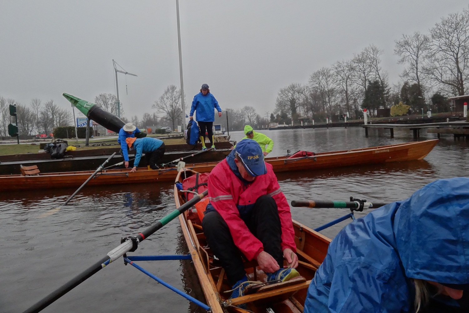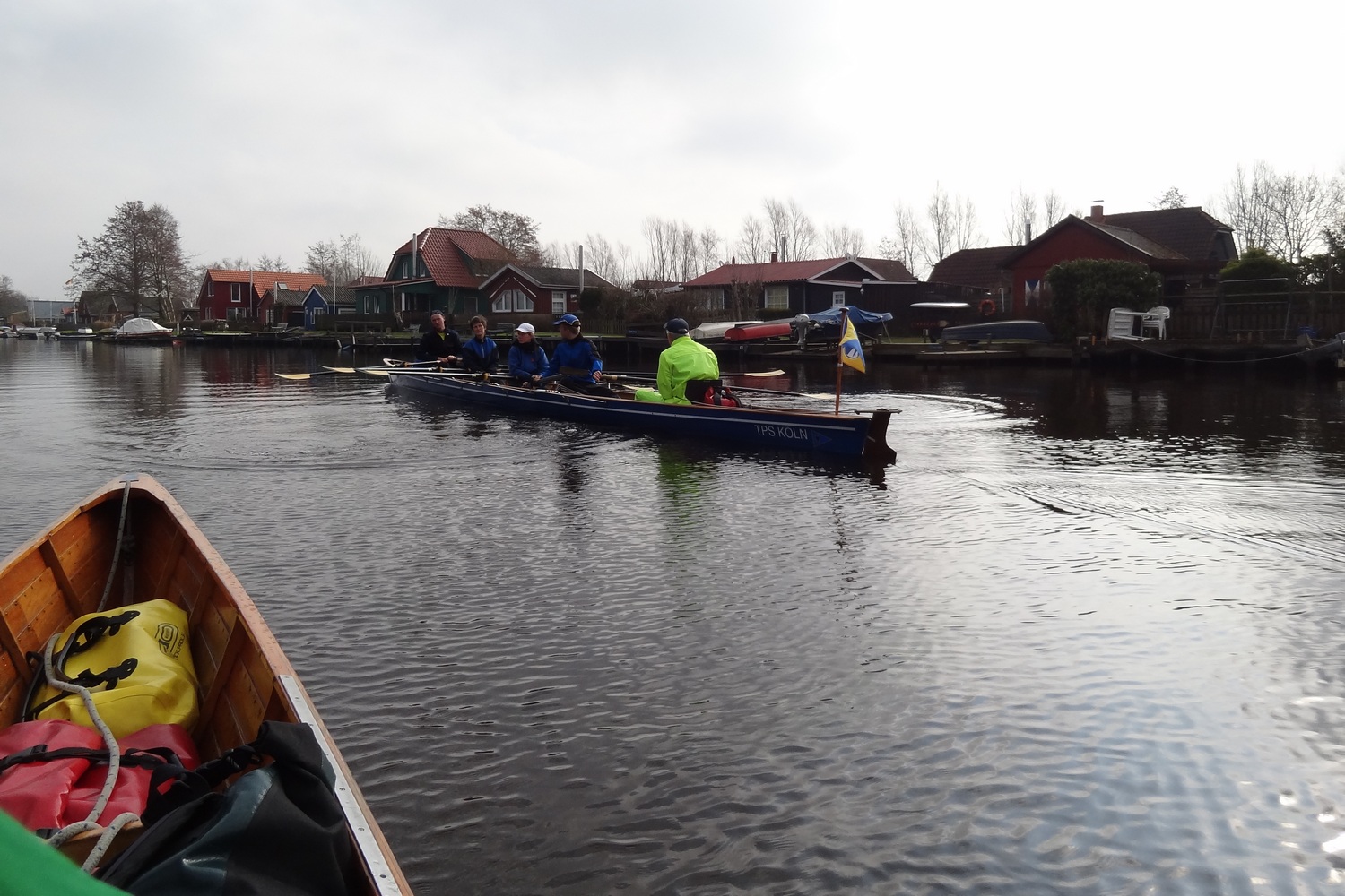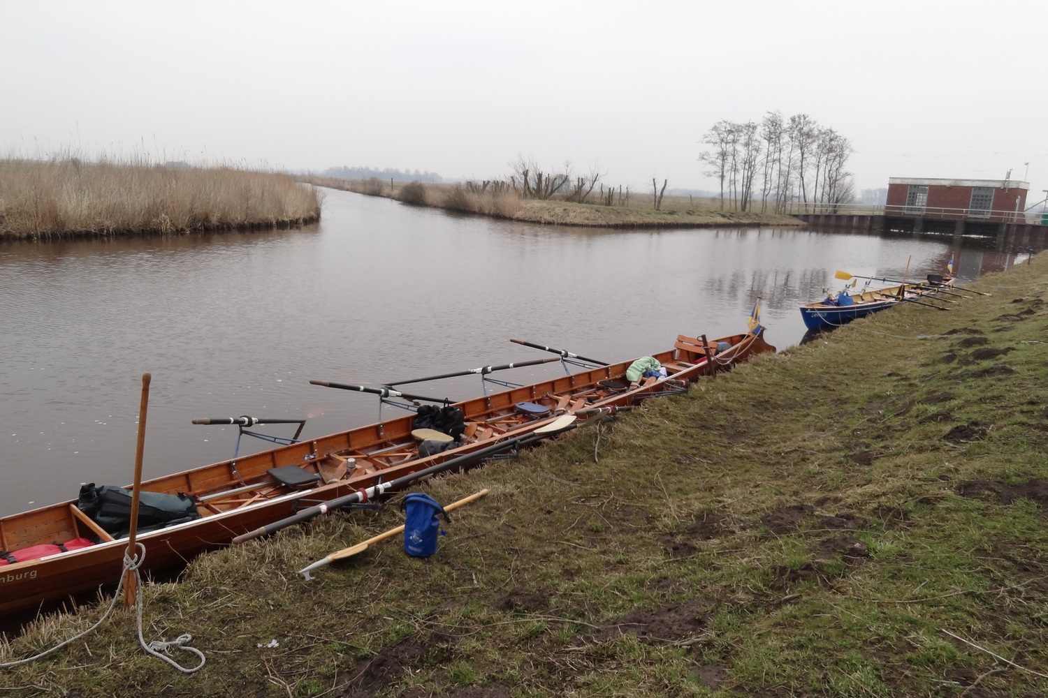 Ganz ungewohnt für uns Flussruderer ist es, dass hier so viele Kreuzungen sind, weshalb Gaby für jedes Boot eine Wasserkarte dabei hatte. Trotzdem wären wir beinahe direkt an der ersten Kreuzung falsch abgebogen: statt wie gewollt durch das Fehntjer Tief wären wir dann durch das Rorichumer Tief gerudert. Zum Glück wurde dieser Fehler aber schnell bemerkt, das Fehntjer Tief ist durch seine Enge und die vielen Kurven nämlich viel interessanter. Nach einiger Zeit hört endlich auch der Nieselregen auf, worüber sich besonders die Steuerleute freuen, die langsam aber sicher auf ihrem Steuersitz festfrieren.