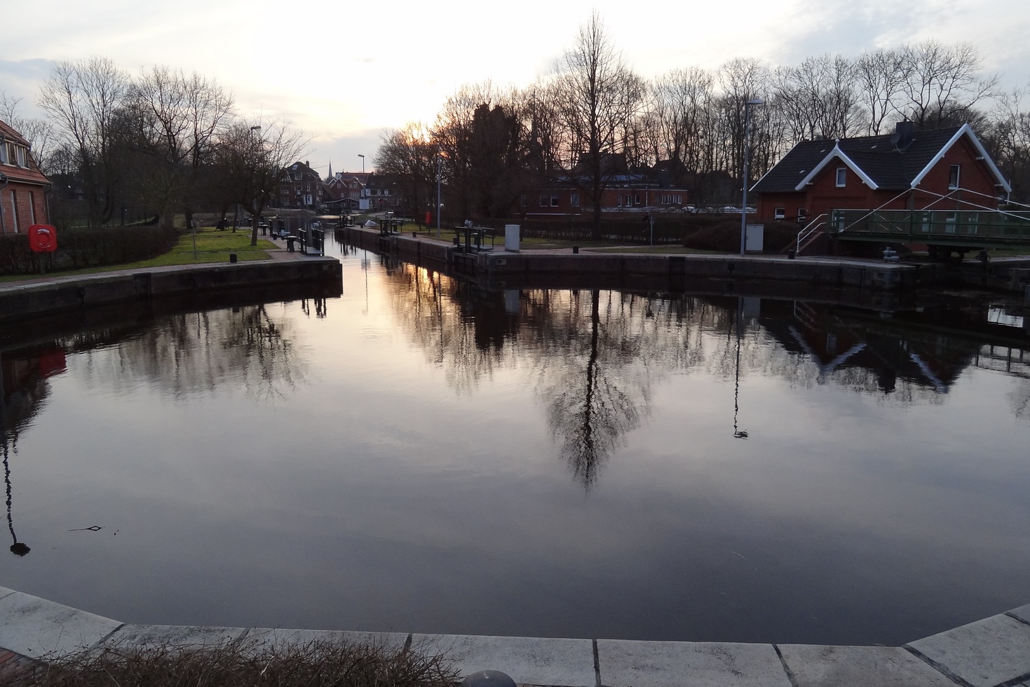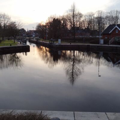 Das letzte Highlight der ersten Etappe ist die Kesselschleuse in Emden, die die Kreuzung des Fehntjer Tiefs mit dem Ems-Jade-Kanal darstellt und somit vier Ausgänge hat. Da Karfreitag aber ein stiller Feiertag ist wird heute nicht geschleust, sodass wir an der Jugendherberge direkt vor der Schleuse von Wasser gehen und die Schleusung erst am nächsten Morgen machen.