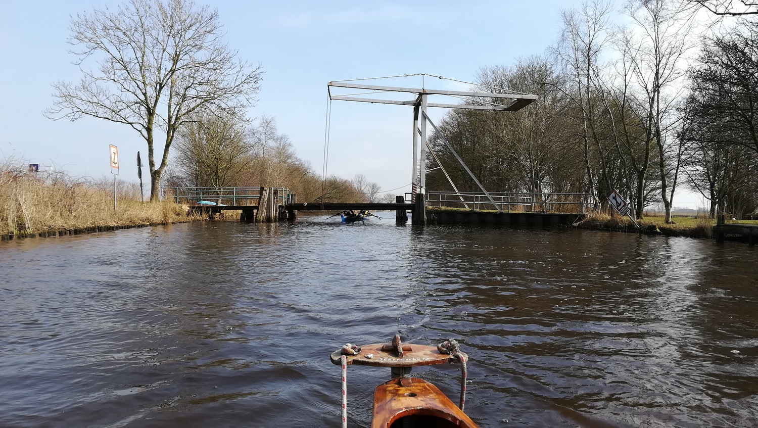 Es wird noch einmal spannend, als ein paar Kilometer vor Emden plötzlich Brücken über das Tief gehen, die gerade mal eine Durchfahrtshöhe von 70 Zentimetern haben. Es heißt also flach hinlegen und hoffen, dass die Nase nicht zu lang ist. Glücklicherweise werden weder Nasen noch Flaggenstöcke gebrochen, letzte hauptsächlich, weil sie vorsorglich aus der Halterung genommen wurden.
