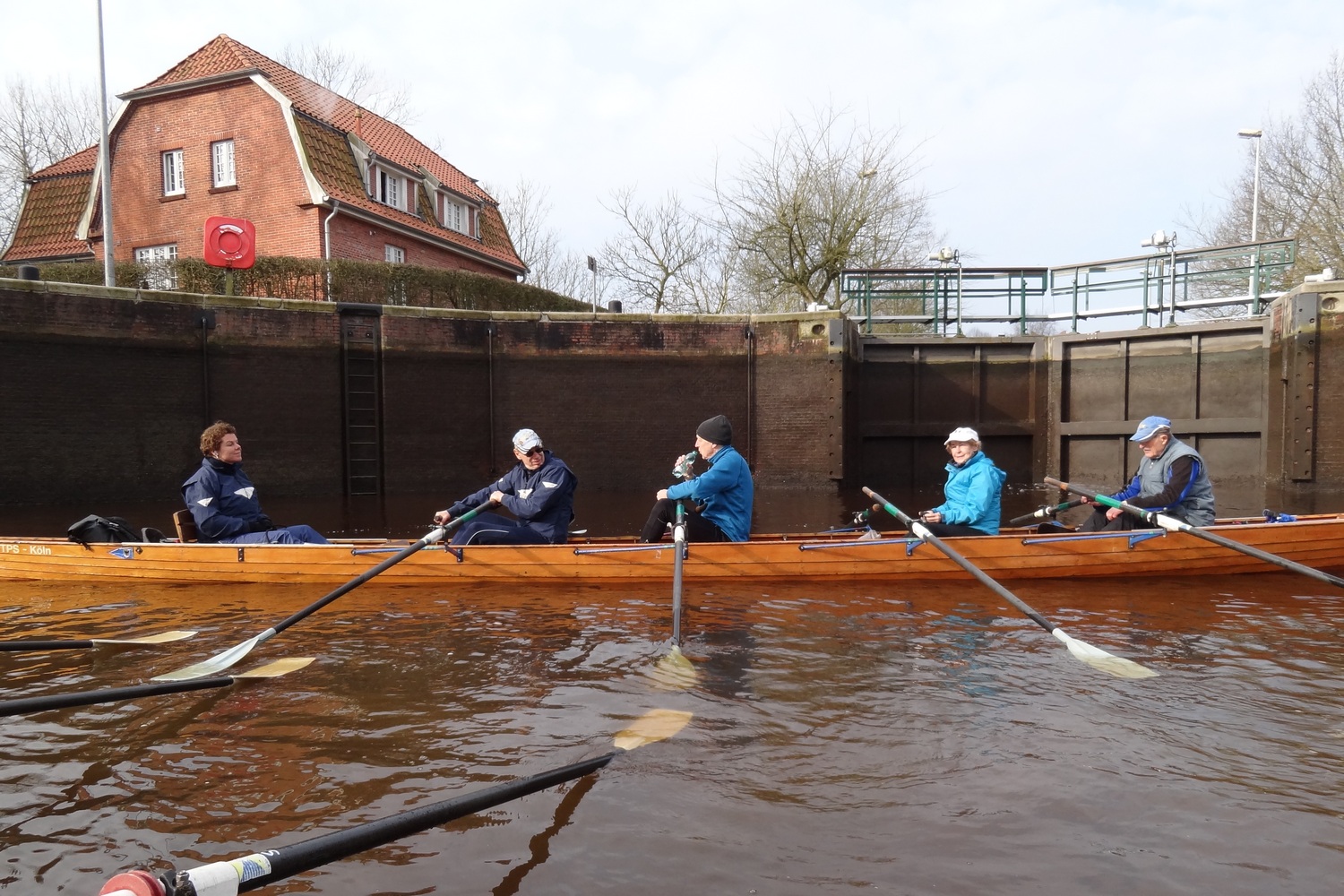 Am nächsten Morgen ist das Wetter besser als alle Wetter-Apps angesagt haben, sodass alle frohen Mutes in die Boote steigen um auf die Schleusung zu warten. Die eigentliche Schleusung stellt sich als unspektakulär heraus, da der Höhenunterschied vom Fehntjer Tief zum Emder Stadtgraben nur ein paar Zentimeter beträgt. Naja, wir können jetzt immerhin von uns behaupten mal in einer Kesselschleuse gewesen zu sein.